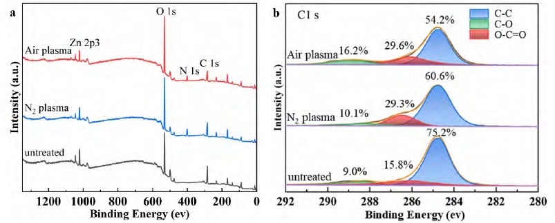 采用XPS測試技術(shù)進一步研究等離子體射流處理前后鋁合金基體表面的化學(xué)成分變化。由圖1.4a中的XPS全譜圖表明等離子體清洗前后的基體表面出現(xiàn)了Zn2p3、O1s、N1s及C1s峰,其相應(yīng)的中心位置分別位于1021.8eV、531.8eV、400.8eV和284.8eV。在經(jīng)過等離子體清洗后,C1s峰的相對強度出現(xiàn)不同程度的降低,而O1s峰強度明顯提升。此外,經(jīng)過空氣等離子體清洗后的基體上O1s峰強度高于氮氣等離子體。在氮氣/空氣等離子處理過程中,N2的電離導(dǎo)致含氮官能團(如N-H和N-O)吸附于鋁合金表面,從而在基體表面出現(xiàn)N1s峰。