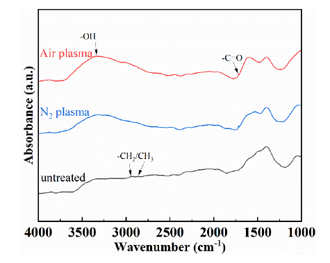 為了研究氮氣/空氣等離子體對鋁合金表面的改性效果,對改性前后的基體進行了紅外測試分析。圖1.5為等離子體清洗前后的鋁合金表面的ATR-FTIR圖譜。原始鋁合金表面的紅外光譜在2925和2867cm-1區(qū)域?qū)?yīng)-CH2/CH3基團的彎曲振動,此為有機吸附物的特征峰。從圖譜中可以看出,經(jīng)氮氣/空氣等離子體改性后基體表面上的-CH2/CH3特征峰強度明顯下降,表明等離子體清洗可有效降低基體表面的碳?xì)湮锏奈?。同時,在譜圖1717cm-1區(qū)域檢測出了微弱伸縮振動吸收峰,其為具有親水特性的-C=O官能團。鋁合金經(jīng)氮氣和空氣等離子體清洗后,在3100~3600cm-1區(qū)域均出現(xiàn)了明顯的-OH的伸縮振動吸收峰。這揭示了在等離子處理過程中,由于電離作用而在基體表面引入羥基等含氧極性基團。另外,相較于氮氣等離子體而言,空氣等離子體清洗后的伸縮振動吸收峰強度更高,意味著在基體表面引入了更多數(shù)量的-OH基團。相比于原始鋁合金基體,經(jīng)等離子體改性后的基體吸附的極性基團可以極大改善表面的親水性,以至于出現(xiàn)超親水特征。
