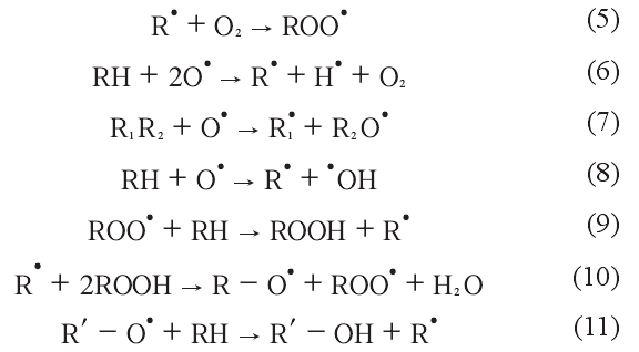 等離子產(chǎn)生的活性種粒子與有機聚合物材料界面將會發(fā)生原子與分子自合反應、生成氫自由基、氧自由基等一系列反應,同時,新生成的自由基還可以繼續(xù)參加有機物界面反應引入官能團,或者與有機聚合物中的高分子單體反應形成界面交聯(lián)結(jié)構(gòu)層或者界面接枝層。其主要反應過程大致如下: